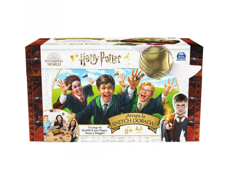 ¡Un trepidante juego de cartas inspirado en el Quidditch de Harry Potter! Coloca el juego de Quidditch al centro y reparte cuatro cartas a cada jugador. ¡Cada jugador intenta hacer conjuntos y parejas para ganar puntos mientras evita las bludgers voladoras! Atrapa la Snitch Dorada para terminar el juego y ser el ganador. Incluye: 1 cofre de Quidditch, 1 Quaffle, 2 Bludgers, 1 Snitch Dorada, 100 cartas y hoja de instrucciones.Edad recomendada: 8 + años